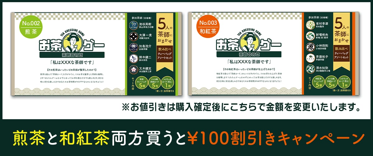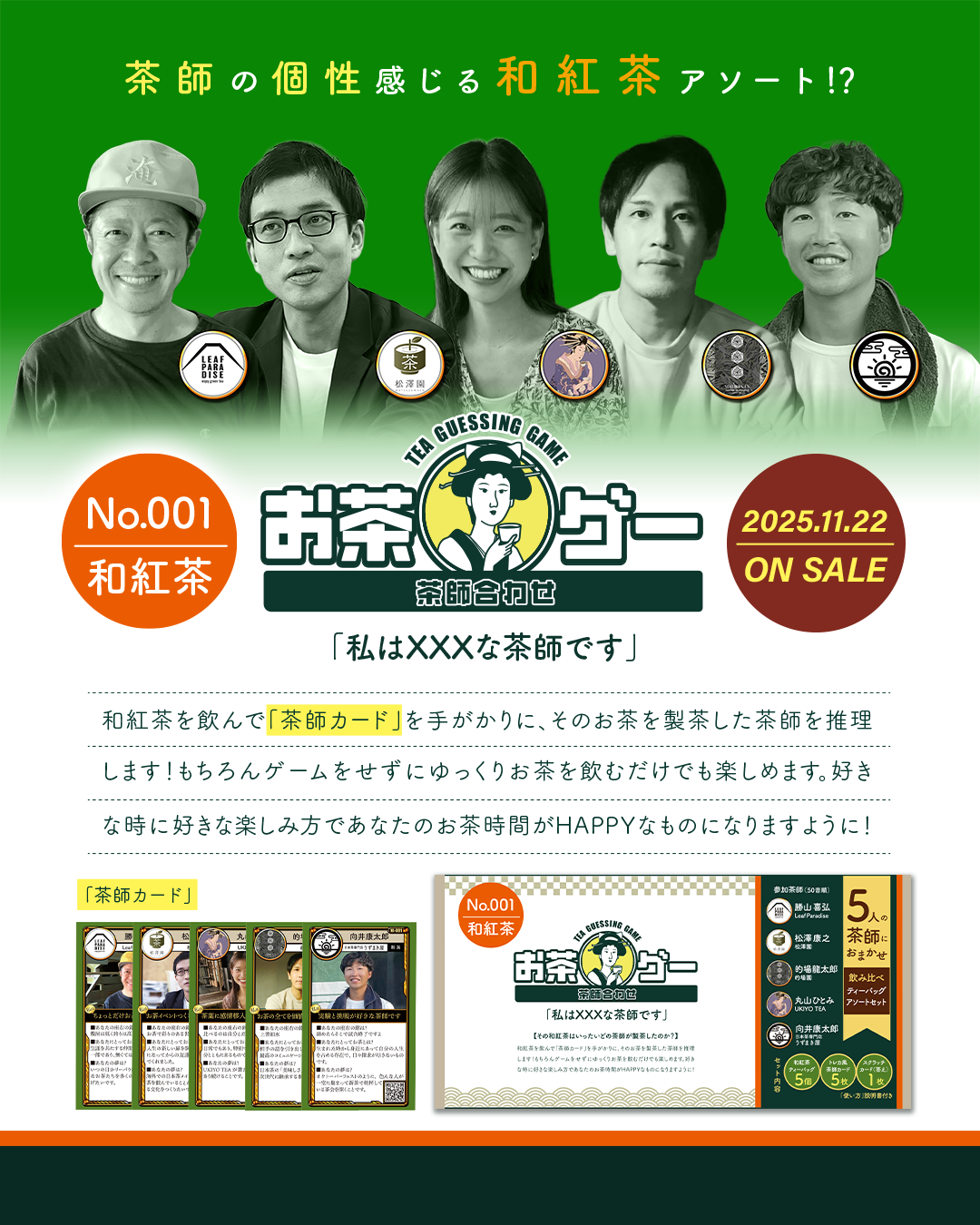 「お茶ゲー 茶師合わせ〜私はXXXな茶師です〜」は個性豊かな5人の茶師による飲み当てゲームもできる日本茶アソートセットです。 この商品一つで5人の茶師の和紅茶をいろいろ楽しむことができるお得な商品です! 【その和紅茶はいったいどの茶師が仕上げたのか?】 和紅茶を飲んで「茶師カード」を手がかりに、そのお茶を仕上げた茶師を推理します!もちろんゲームをせずにゆっくりお茶を飲むだけでも楽しめます。 【参加茶師】 ・ヤマカ勝山商店 勝山喜弘さん ・松澤園 松澤康之さん ・的場園 的場龍太郎さん ・UKIYO TEA 丸山ひとみさん ・日本茶専門店うずまき屋 向井康太郎さん <概要> ・お茶は5色に色分けされたパッケージの1煎パックです。 ・パッケージにはお茶の情報は記載されていません。 ・和紅茶を製茶した茶師は、スクラッチをこするとわかります。 ・1人でも複数人数でも楽しむことができます(1人〜5人推奨)。 ・飲み当てゲームをしたい人もお茶を飲むだけの人も楽しむことができます。 ・茶師カードは「茶師のプロフィール」や飲み当てのヒントとなる茶師の「お茶作りへの想い」や今回使用した「お茶の特徴」などを知ることができます。 飲み当てゲームはいたってシンプルです。 1)お茶を淹れて飲む 2)茶師カードの裏面を読んでどの茶師のお茶か推理する 3)スクラッチをこすって答えあわせをする ※前作ではお茶の淹れ方が特殊だったりお茶を評価するという流れがありましたが今回はそういったものがなくいたってシンプルです。 <楽しみ方の例> 使い方に決まりはありませんがこんな楽しみ方もあります。 【1人でのんびりと】 ・気になる茶師のお茶を日ごとに1種類づつ飲む。 ・5種類のお茶の飲み当てゲームをする。 【みんなでわいわい】 ・5人で1人1種類ずつお茶を選んで自分がどれを飲んだか当てる。 ・5種類のお茶をみんなでシェアして飲み当てゲームをする。 「お茶ゲー」の目的はお茶を当てることではありません。 飲み手がお茶を当てることでワクワクしたり、お茶に五感を集中させたり、作り手の話をじっくり読もうとすることが一番が大事なことと考えています。どうか当たらなくてもがっかりせずにお茶の違いを感じたことに喜びを感じてほしいです。 【茶師合わせの今後の展開】 お茶ゲー〜茶師合わせ〜は「No.001和紅茶」を皮切りに、スピード感をもって新しいシーリズを発表し、お茶の種類や産地など様々なテーマで全国のお茶と生産者さんを紹介していくメディア的な役割も果たす商品を目指していきます。