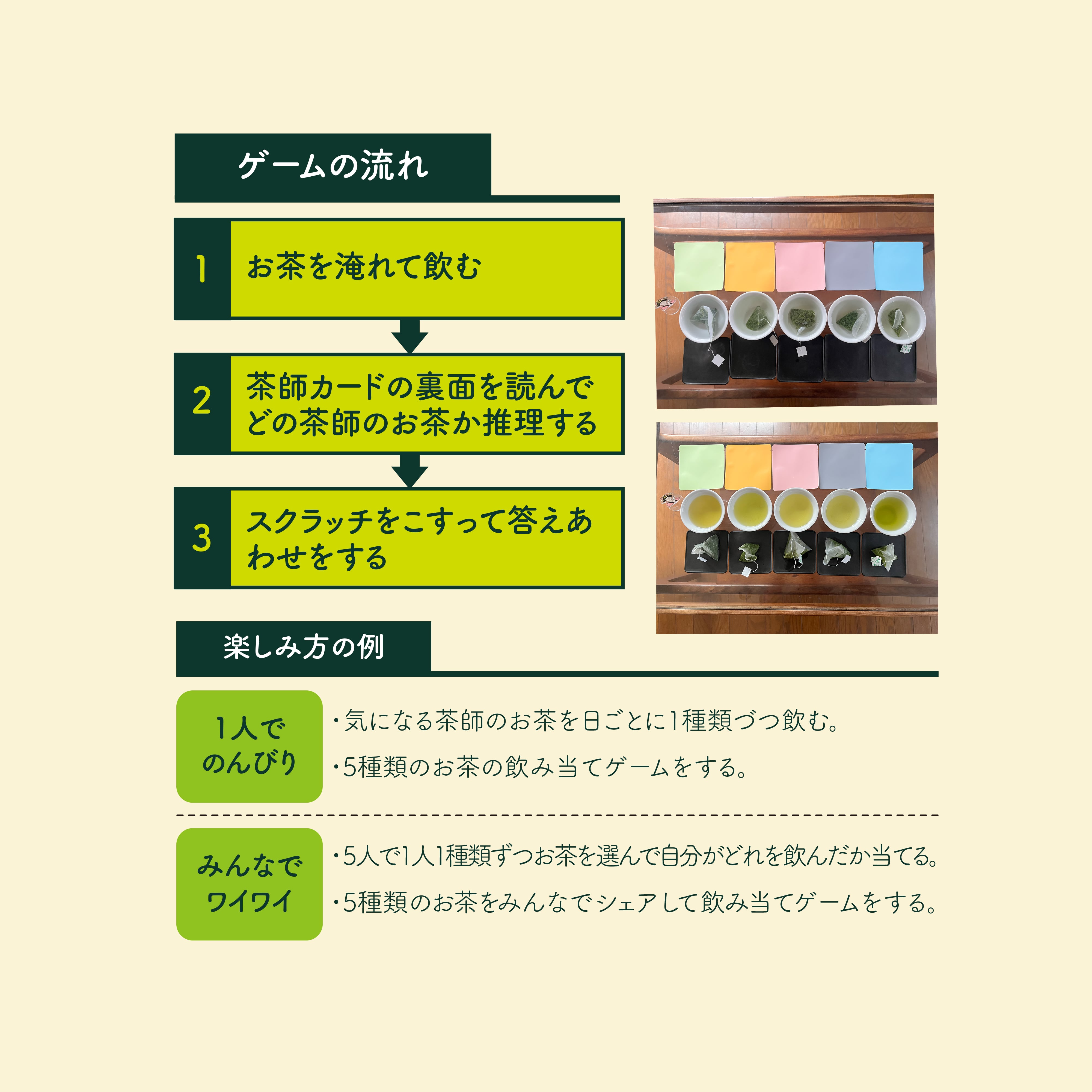 「お茶ゲー 茶師合わせ〜私はXXXな茶師です〜」は個性豊かな5人の茶師による飲み当てゲームもできる日本茶アソートセットです。